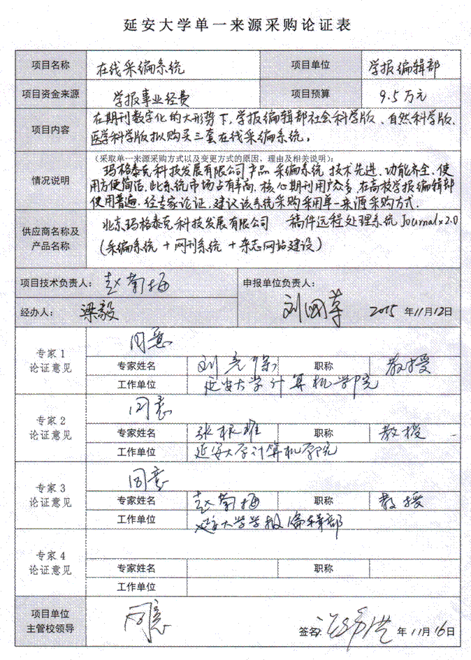 米兰milan官方网站学报采编系统采购项目拟采购采编系统三套(社会科学版、自然科学版、医学科学版各一套)。拟采取单一来源采购方式采购,由北京玛格泰克科技发展有限公司提供。现将有关情况向潜在供应商广泛征求意见。征求意见期限从2015年11月16日起至2015年11月20日止。潜在供应商对公示内容有异议的,请于公示期满后2个工作日内以实名书面(包括联系人、地址、联系电话)形式将意见反馈至米兰milan官方网站国资处(联系电话:0911-2332042)和米兰milan官方网站纪委监察处(联系电话:0911-2332090)。