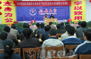 为贯彻落实中共中央办公厅《关于加强共产党员经常性教育的意见》等四个保持共产党员先进性长效机制文件精神,11月23日下午,校党委组织部组织各院党委,党总支、直属党支部,各生活党支部书记、副书记、委员,在学生活动中心举办培训班,由校党委书记刘建德同志进行了首场讲座。