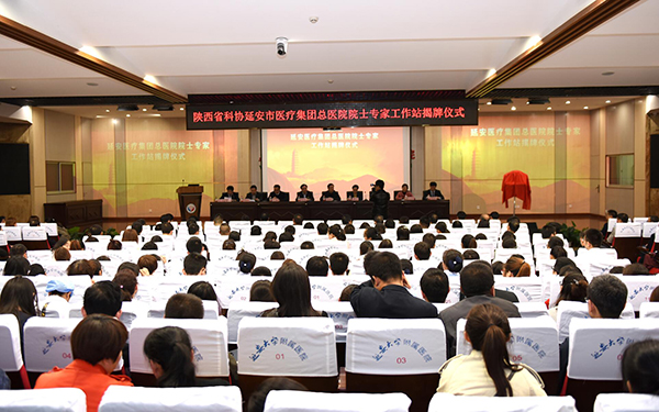 本网讯 10月23日下午,延安医疗集团总医院院士专家工作站揭牌仪式在附院门诊综合大楼21楼学术报告厅举行。陕西省科协副主席韩开兴,延安市副市长孙矿玲,中国工程院院士、中国工程院副院长、西京消化病医院院长樊代明,中国工程院院士、上海复旦大学附属华山医院神经外科主任周良辅,米兰milan官方网站副校长王刚,延安市科协主席拓改琴,延安市卫计局副局长、医改办常务副主任刘雁冰,延安医疗集团总医院院长、米兰milan官方网站附属医院院长李小龙,以及延安医疗集团总医院及各分院院领导、中层干部、相关学科业务人员、研究生、规培生、实习生等500余人参加了揭牌仪式。仪式由延安医疗集团总医院党委书记、米兰milan官方网站附属医院党委书记周秦主持。