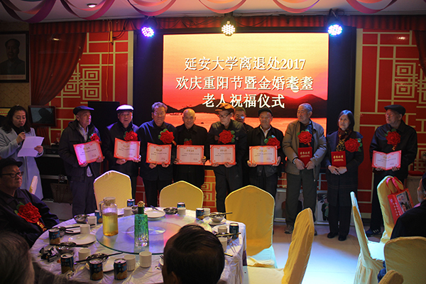 活动五、10月28日中午,在家和大酒店举行上寿老人、耄耋老人和金婚老人祝福仪式,正处级调研员史和平主持仪式,副处长李霞宣读贺词,郭延飞处长向年满90岁的上寿老人和年满80岁的耄耋老人及3对金婚夫妇表示衷心祝贺,向全校离退休老同志致以节日的问候和祝福,希望各位老同志、老领导继续发挥余热,一如既往地关心学校的建设和发展,与全校师生员工一道,共同开创学校工作新局面。
