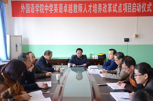 本网讯 11月13日下午,外国语学院举行了“中学英语卓越教师人才培养改革试点项目”的启动仪式,校党委副书记王顺、教务处处长付峰出席了启动仪式,外国语学院党委书记董振文等领导、教师代表以及卓越人才实验班的28名学生一同参加了活动。启动仪式由外国语学院院长吴卫东主持。