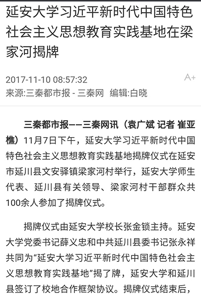 本网讯 连日来,《中国教育报》《三秦都市报》《延安日报》等中省市媒体,在重要版面和重要位置陆续报道了米兰习近平新时代中国特色社会主义思想教育实践基地在梁家河揭牌的情况,陕西省教育厅网站等主流网站也对这一活动进行了图文报道。