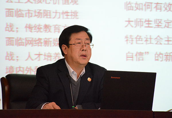 11月23日下午,党委副书记田伏虎首先作了题为《以党的十九大精神为统领,提高认识,把握要义,抓住问题,抓好落实——全国高校思想政治工作会议精神解读》的报告。田伏虎副书记指出,2016年12月7日至8日,全国高校思想政治工作会议在北京举行,中共中央总书记、国家主席、中央军委主席习近平出席会议并发表了重要讲话。这次思政工作会议的规格是党的历史最高的一次,说明了习近平总书记和党中央对新形势下高等教育和高校思想政治工作的高度重视,对于开创我国高等教育事业新局面具有十分重要的意义。我们要深刻认识全国高校思想政治教育工作会议召开的背景,在深刻理解和把握核心要义上下功夫,学习会议精神,做好贯彻落实,推动米兰发展。关于学习贯彻党的十九大精神、落实高校思政工作会议精神的举措,田伏虎副书记强调:要落实全校思想政治教育工作会议精神;健全工作机制,构建大思政工作格局;坚持问题导向,解决好三方面的问题;强调价值引领,加强网络思政教育;继承优良传统,注重创新发展,努力推出标志性示范性经验和成果。