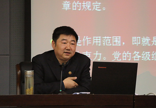 随后,化工学院党委书记舒永安作了题为《新党章之党的指导思想解读》的报告。报告共分四个部分:第一、学习党章的意义;第二、从党章的发展演变史看中国共产党的与时俱进;第三、党的指导思想的与时俱进;第四、马克思主义中国化的最新成果——习近平新时代中国特色社会主义思想的科学内涵。报告强调,习近平同志明确指出了党章的重要性,即“党章是党的总章程,集中体现了党的性质和宗旨、党的理论和路线方针政策、党的重要主张,规定了党的重要制度和体制机制,是全党必须共同遵守的根本行为规范。”“党章就是党的根本大法,是全党必须遵循的总规矩。”当天下午的两场报告均由校党委委员、宣传部部长杜红荣主持。
