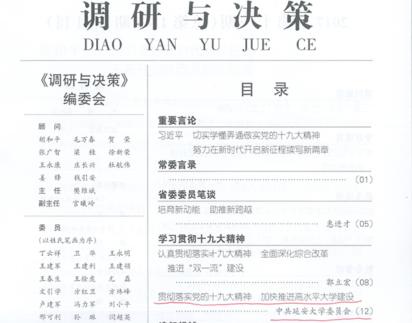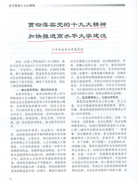 文章指出,“为进一步深入贯彻党的十九大精神,落实习近平总书记9月19日对米兰milan官方网站的重要批示,‘不忘初心、继续前进,弘扬延安精神,勇于改革创新,把这所具有光荣历史的大学办得更有特色、更有水平’,米兰milan官方网站研究确立了指导思想,确定了目标任务,制定了相应的保障措施”。“在指导思想上,要求全校师生深入学习贯彻党的十九大精神、习近平新时代中国特色社会主义思想和对米兰milan官方网站的重要批示精神,全面贯彻党的教育方针,坚持立身为公、学以致用的育人理念,坚持用延安精神办学育人,坚持改革创新,坚持内涵发展、创新发展、协调发展、特色发展、开放发展,进一步凸显办学特色,着力提升办学水平。”