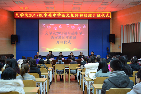 本网讯 12月15日下午,文学院在路遥报告厅举行2017级卓越中学语文教师实验班开班仪式。副校长武忠远,教务处处长付峰,文学院院长梁向阳、党委书记马延龙、副书记李伟以及实验班校内外指导教师等参加开班仪式。开班仪式由文学院副院长王俊虎主持。