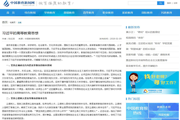 文章指出,高校承担着人才培养、科学研究、社会服务、文化传承创新、国际交流合作的重要任务,高等教育事关科教兴国战略、人才强国战略、可持续发展战略的有效实施和持续发展。习近平在全国高校思想政治工作会议上强调:“教育强则国家强。高等教育发展水平是一个国家发展水平和发展潜力的重要标志。实现中华民族伟大复兴,教育的地位和作用不可忽视。我们对高等教育的需要比以往任何时候都更加迫切,对科学知识和卓越人才的渴求比以往任何时候都更加强烈。”习近平的系列讲话精神,充分体现了习近平的高等教育思想,闪耀着马克思主义真理的光芒。