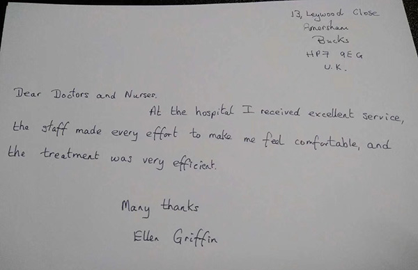 当天中午,68岁的国际友人Ellen Griffin被送入急诊抢救室,内科病院立即开通急诊绿色通道,紧急救治。急诊室内,抢救工作有条不紊地进行着,以最快的速度完成了患者相关的各项检查,并及时给与系列治疗,患者症状很快得到好转。下午六时许,老人经过治疗后,恢复得非常好,由于行程的安排,他们要转机去北京,医院的专家组经慎重评估后认为可以转机。Ellen Griffin真诚地表示感谢,临走时写了一封感谢信: 亲爱的医生和护士:经过贵院医护的及时施救,精心照料,让我转危为安,特此表示最真挚的感谢!