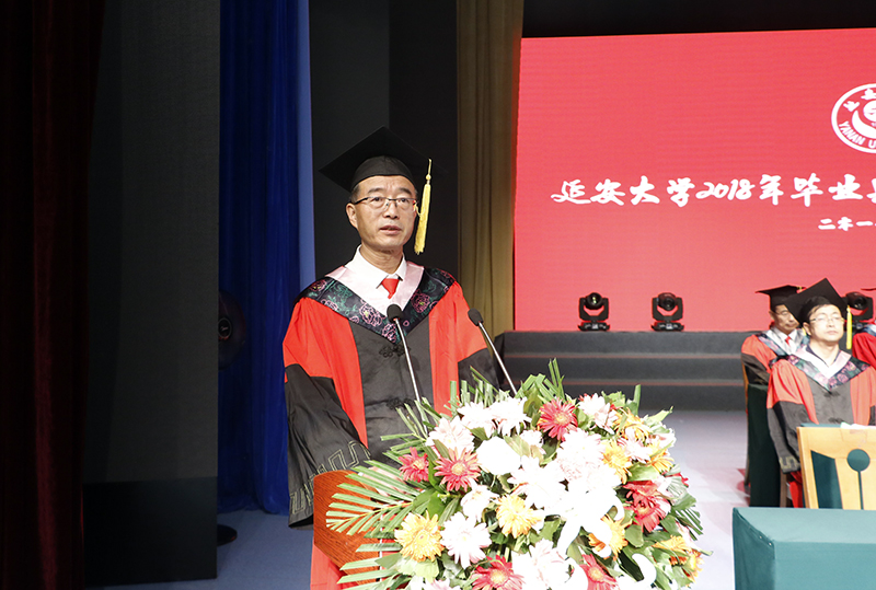 校长、校学位评定委员会主席张金锁在毕业典礼暨学位授予仪式上作了题为《弘扬延安精神,勇做新时代的奋斗者》的讲话。张校长首先代表学校,对顺利完成学业、即将走向人生新征程的3629名毕业生表示热烈祝贺。随后,张校长深情回顾、充分肯定了2018届毕业生在德智体美等方面所展示的青春风采和取得的优异成绩,并对四年来同学们与学校同呼吸、共命运、心连心,推动学校快速发展所做出的贡献表示感谢。张校长在讲话中按照新时代的战略安排,结合2018届同学的成长时间节点,历史地憧憬与勾画了他们在新时代我国社会主义现代化强国建设的各个阶段的人生发展前景,希望广大毕业生以不懈的奋斗、卓越的业绩来回报这个伟大的时代。