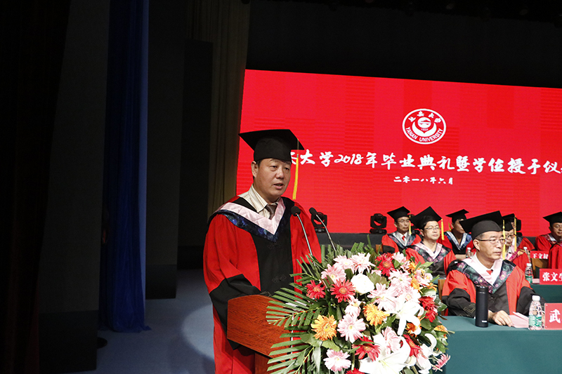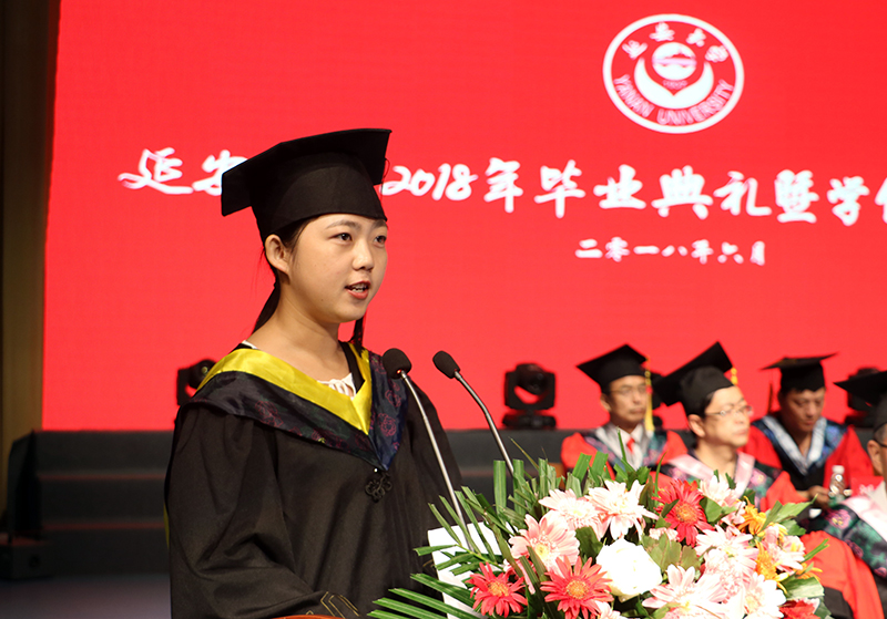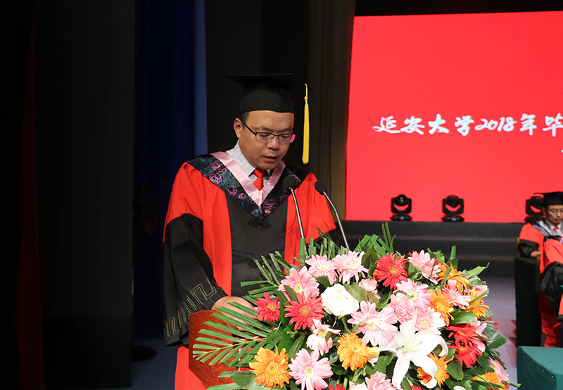 校党委书记薛义忠向毕业生代表赠送了《梁家河》一书。化工学院2018届本科毕业生姚赛和陕西省教学名师、公管学院教授任晓林分别作为学生代表和教师代表发了言。