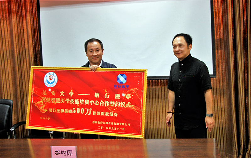 于福东总裁介绍了苏州敏行医学信息技术有限公司的发展历程,该公司专注于医学教育智能化,以医学现代教育技术为支撑,推动医学教育变革,致力于中国医教同质化。随后,于总裁代表公司向米兰捐赠了价值500万元的智慧医教设备,医学院党委书记葛彬代表学校接受捐赠。最后,武忠远副校长和于福东总裁代表双方签订了米兰milan官方网站与敏行医学共建智慧医学技能培训中心。