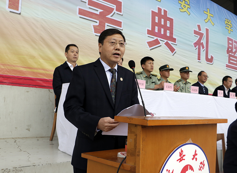 随后,校党委书记薛义忠向军训旅授旗,军训旅旅长杜空军代表军训旅接旗。校武装部副部长王彦杰宣读了军训旅纪律,军训旅参谋长冯武刚带领全体参训学员宣了誓。杜空军旅长在讲话中对同学们提出了三点要求,一是提高思想站位,强化责任担当;二是传承红色基因,磨砺意志品质;三是强化号令意识,加强组织管理。他希望同学们铭记历史、不忘初心、努力学习、刻苦训练,使今年的军训工作再上新台阶,以优异的成绩回报习近平总书记对我们的嘱托和期望。