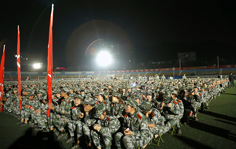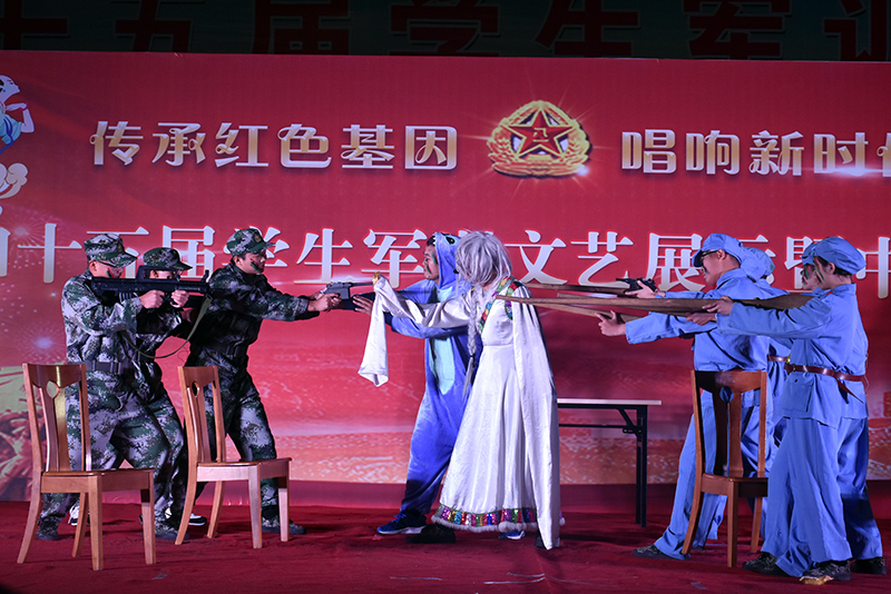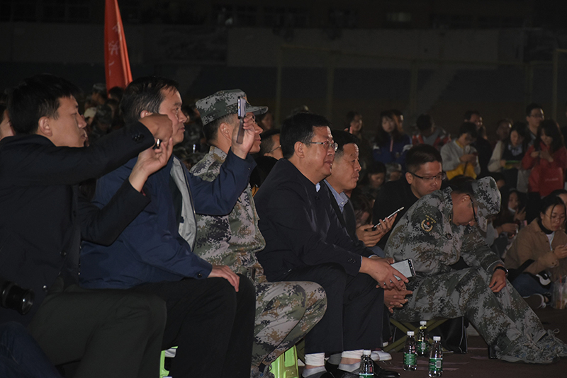 9月24日中秋当晚,军训旅在田径场举行了以“传承红色基因·唱响新时代旋律”为主题的军训文艺展示暨中秋联欢晚会,校党委副书记田伏虎和全体军训学员、教官一起观看了演出。