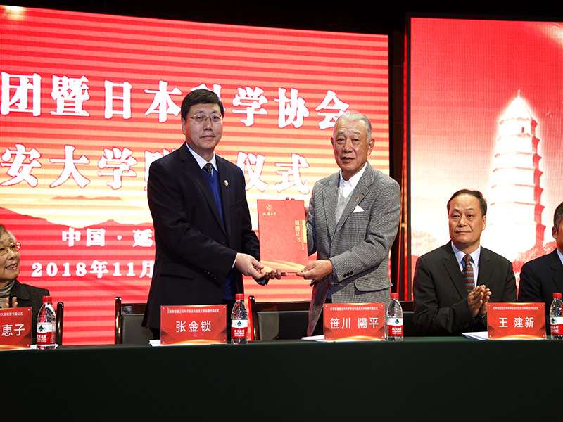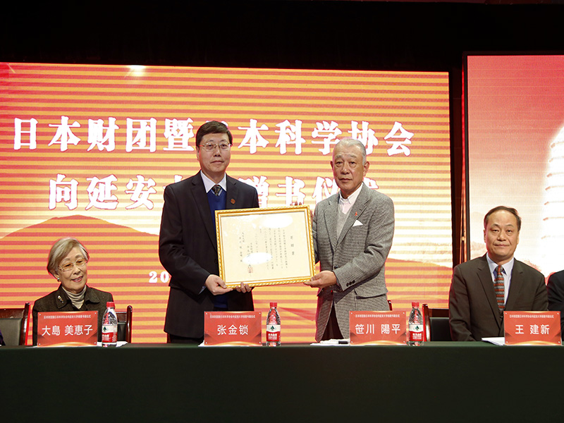 张金锁校长向日本财团会长笹川阳平递呈捐赠证书