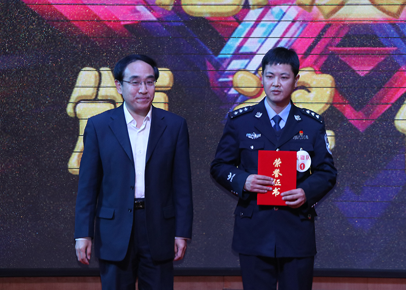 司法部普法与依法治理局副巡视员刘宪国为冠军选手程平颁奖
