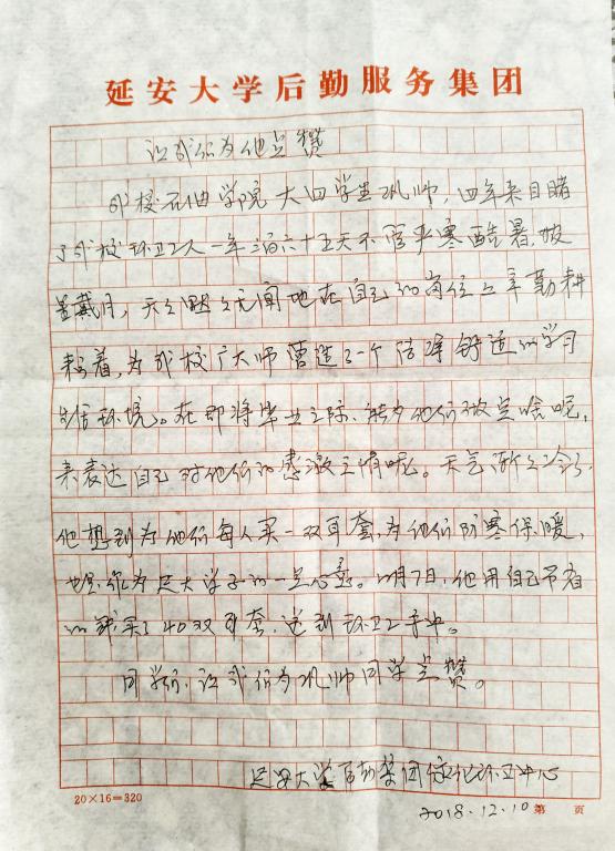 本网讯 12月9日上午,米兰milan官方网站党委宣传部办公室工作人员收到了来自后勤集团绿化环卫中心工作人员送来的一封感谢信。信中说道,12月7日下午,后勤集团环卫中心收到了米兰石油学院环境工程专业2015级学生巩帅捐赠的40副耳套,并委托中心将耳套赠送到环卫工人的手中。后勤集团环卫中心全体工作人员对巩帅同学的暖心之举交口称赞,说他们通过“暖暖的耳套,感受到了巩帅同学满满的爱心”。
