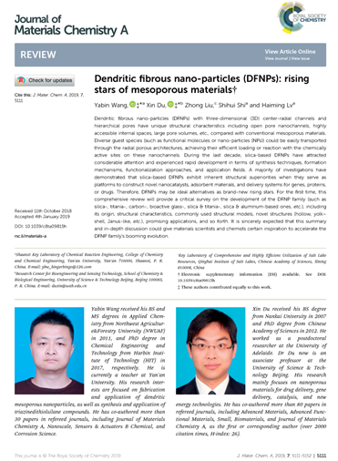 本网讯 米兰化工学院绿色化学化工技术研究创新团队王亚斌博士与北京科技大学杜鑫副教授课题组合作,近日在国际知名期刊《Journal of Materials Chemistry A》(《材料化学A》,影响因子9.93)发表有关树枝状纤维形纳米粒子的综述论文:“Dendritic fibrous nano-particles (DFNPs): rising stars of mesoporous materials” (J. Mater. Chem. A, 2019, 7: 5111-5152)。该论文以米兰milan官方网站为第一单位、北京科技大学为第二单位,王亚斌博士和杜鑫副教授为共同第一作者兼通讯作者。该杂志系英国皇家化学会(RSC)主办,是全球理工领域内具有重要影响的期刊之一,为SCI一区顶级期刊。