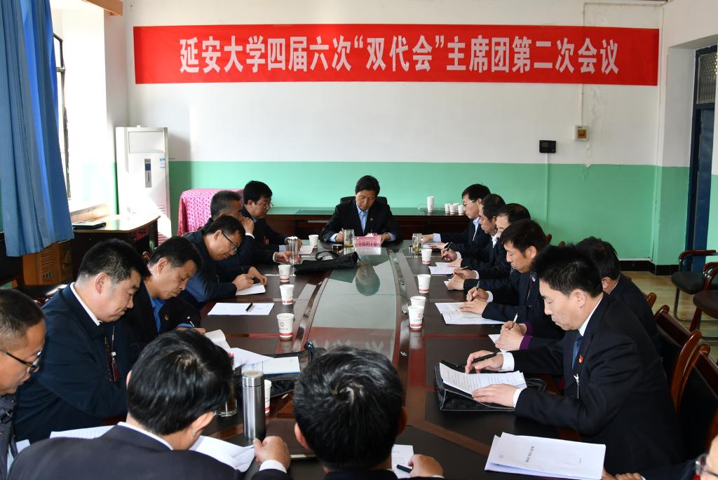闭幕式之前,“双代会” 主席团第二次会议在外语学院会议室举行,全体主席团成员、各代表团团长参加了会议。会议由主席团主席、校党委书记薛义忠主持。会上,6个代表团团长分别汇报了分组讨论情况。随后,主席团成员审议通过了四届六次“双代会”校长工作报告、学校财务工作报告、工会工作报告、工会经费审查报告和学校提案工作报告等5个报告的决议(草案)。