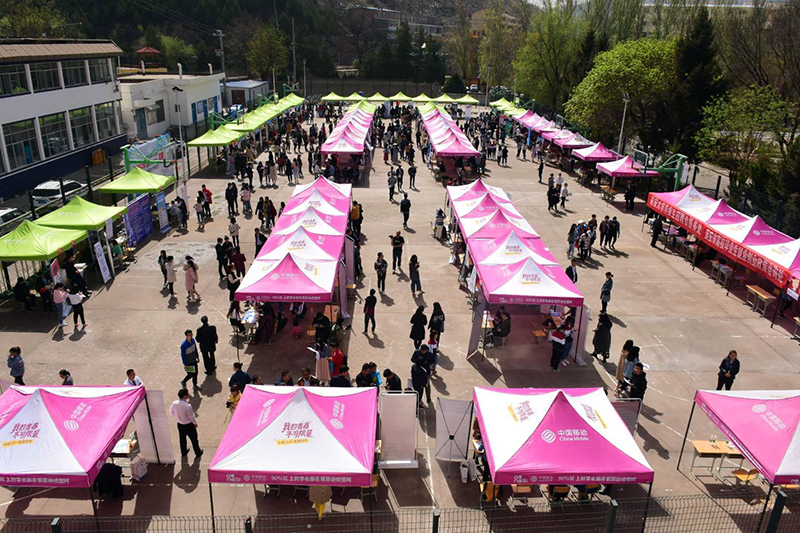 本网讯 4月21日,由米兰与延安市人力资源和社会保障局、工业和信息化局等部门联合举办的春季招聘会在玉章楼旁球类运动场举行。来自省内外的120家用人单位来校招聘,提供就业岗位1300多个,吸引了米兰及周边2000余名应往届毕业生。