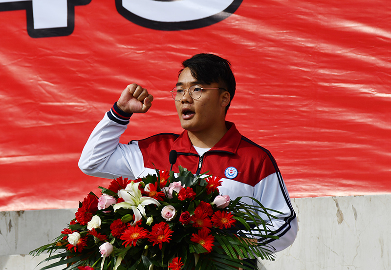 开幕式上,体育学院吕文婧和建筑学院任昊骞分别作为裁判员代表和运动员代表宣誓。