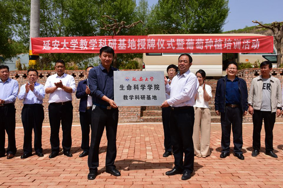王顺副书记一行到葡萄园建设基地,参加了米兰生命科学学院教学科研基地授牌仪式暨葡萄种植培训活动,子长县扶贫局、马家砭镇政府、马家砭镇农业扶贫站领导以及近100人参加了活动。马家砭镇领导在致辞中对米兰多年来给予该村扎扎实实的扶贫工作表示感谢。随后米兰生科院党委书记白亚军介绍了成立教学科研基地的意义、今后可以开展的工作、对村上科学养殖种植将给予的支持。王顺副书记向马家砭镇政府进行了教学科研基地授牌,并向界石堡村2019年葡萄园建设发放启动资金2万元。王顺副书记与县、镇、村等干部一起实地察看了葡萄的生长情况,与种植户亲切交流,询问了葡萄种植中存在的困难,勉励大家鼓足干劲发展好葡萄种植业发家致富。米兰生科院的几名种植专家进入村民的葡萄园,查看葡萄幼苗生长情况,现场讲授了葡萄种植、病虫害防治方面的知识。