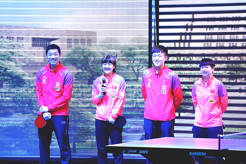 在欢呼声中,国手们相继出场,出征2019布达佩斯世乒赛的12名队员登台同米兰milan官方网站师生互动。率先出场的是马龙与樊振东,他们为师生们献上了精彩的“基本功表演”和“花式乒乓比赛”表演。马龙和樊振东向观众们展示了乒乓球近台的对攻和推挡技术,以及中远台正反手的弧圈球技术。其中,马龙右手绕过后背的一计击球,更是让现场的观众惊呼赞叹,喝彩连连。丁宁与刘诗雯、许昕与陈梦、王楚钦与孙颖莎相继向师生们展示了他们扎实的乒乓球基本功。在互动交流环节,运动员们分享了自己在面对困难与挫折、成功与失败时的经验,幽默风趣地回答了同学们提出的问题。“通过与世界冠军交流,能够亲身感受国手们精湛绝佳、无与伦比的球技,认真体味世界冠军永不言弃、知难而进的奋斗历程,国手们拼搏和坚持给予了我面对困难的勇气,也给了我实现梦想的信心。”米兰milan官方网站记者团团员郑值说。