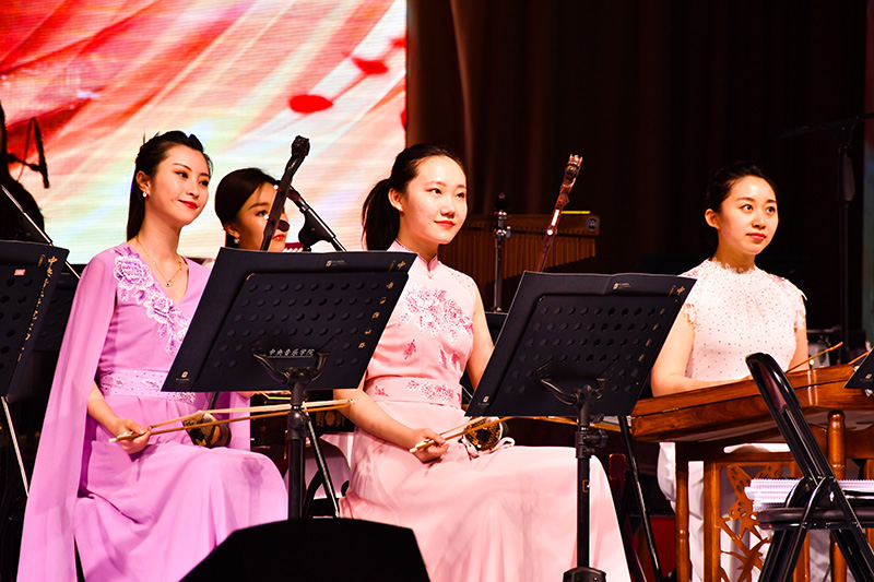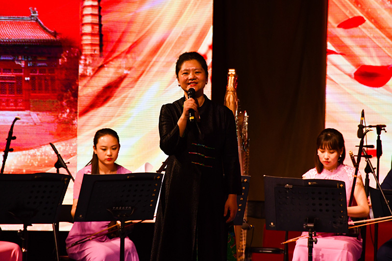在音乐会的最后,乐团还为大家演奏了即将录制的快闪主题曲《我和我的祖国》,为祖国献礼。演出过程中,陈冰老师穿插介绍了中胡、板胡、高胡、二胡、磬等乐器,并邀请演奏人员向观众进行了展示。