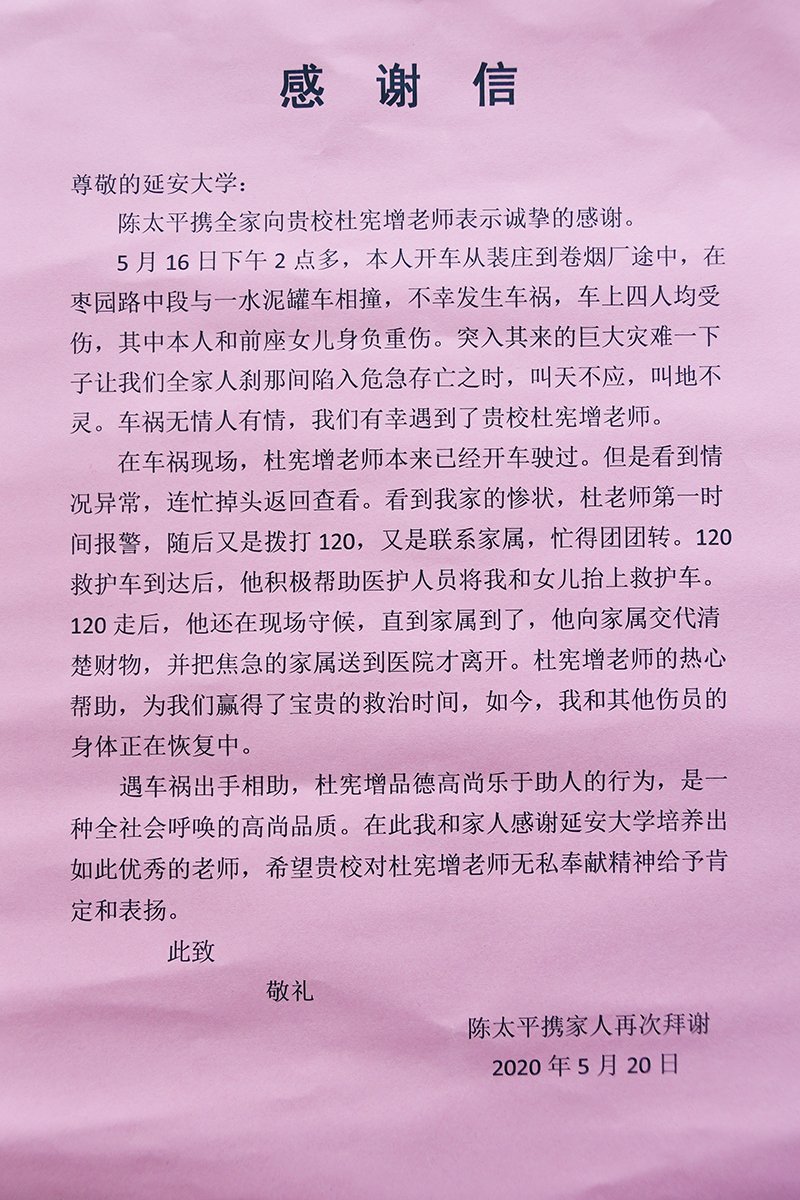 信中说:“杜宪增老师的热心帮助,为我们赢得了宝贵的救治时间。如今,我和其他伤员的身体正在恢复中。遇车祸出手相助,杜宪增乐于助人的行为,是一种全社会呼唤的高尚品质。在此,我和家人感谢米兰milan官方网站培养出如此优秀的老师。”
