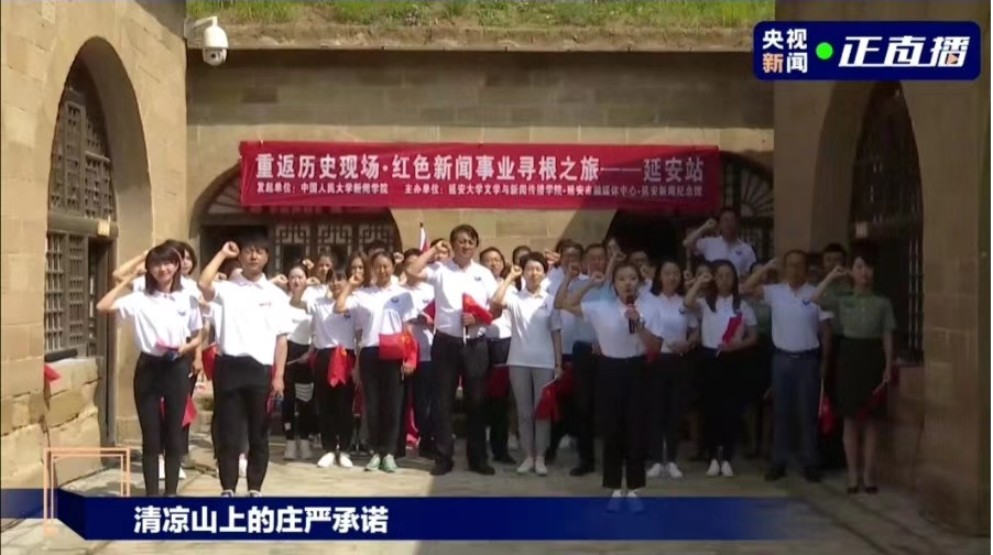 米兰milan官方网站新闻系教师郭小良从华侨青年王唯真回国抗战、奔赴延安切入给大家讲述了华侨青年奔赴延安、从事新闻宣传工作的具体史实。在米兰milan官方网站苑志鑫同学的带领下,大家举起右拳,面向宝塔山,向党和人民做出了新闻工作者庄严的承诺。直播中,文学与新闻传播学院院长梁向阳讲到,1946年米兰milan官方网站创办的新闻班是中国共产党创办的第一个大学新闻新闻专业,今天重返新闻历史现场就是为了寻找初心、淬炼灵魂,守正创新再出发。