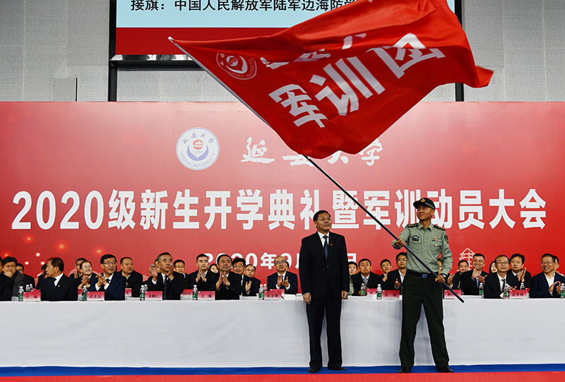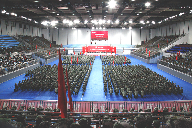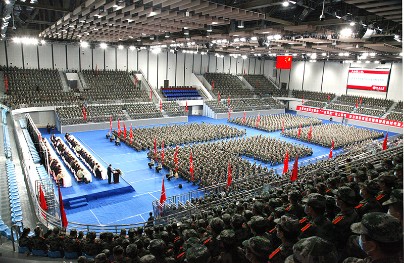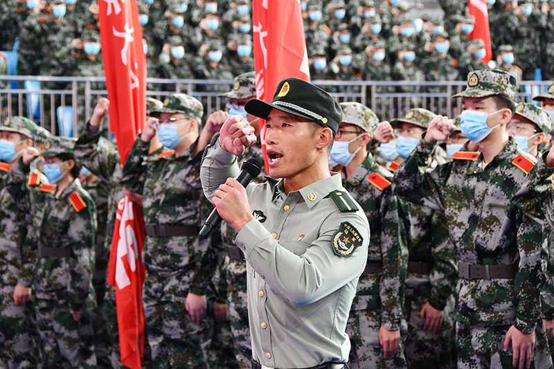 张金锁向军训团授旗,军训团团长李智上校接旗。校武装部副部长王彦杰宣读了军训团纪律,军训团五营营长白林强带领全体参训学员宣誓。岳晓军在讲话中强调,全体参训同学一是要有保家卫国的责任担当;二是要有不怕苦,不怕累的意志品质;三是要有服从命令,令行禁止的号令意识。他希望同学们以“敢问天地试锋芒,披荆斩棘谁能当”的青春朝气,以“长风破浪会有时,直挂云帆济沧海”的勇敢自信,以“红军不怕远征难,万水千山只等闲”的乐观精神,努力学习、刻苦训练,在训练场书写无愧于自己的绚丽一笔。