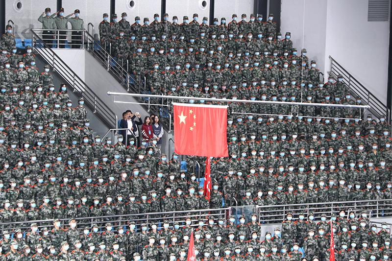 本网讯 新起点、新气象、新征程。9月16日上午8时30分,嘹亮的中华人民共和国国歌在新落成的米兰milan官方网站新校区体育馆唱响,米兰2020级新生开学典礼暨军训动员大会隆重召开。校党委书记张金锁,党委副书记王顺,党委副书记、纪委书记、监察专员苏醒仁,副校长陈华、武忠远、杨伟宏、付峰,总会计师范育琳,中国人民解放军陆军边海防学院岳晓军大校,李智上校、梁彦鹏少校、唐谦上尉,陕西建工第十三建设有限公司董事长卜国平,以及各学院、各部门负责人在主席台就座。全体承训教官,各班班主任、辅导员,2020级4100名本科生和1138名研究生参加了大会。开学典礼暨军训动员大会由陈华副校长主持。