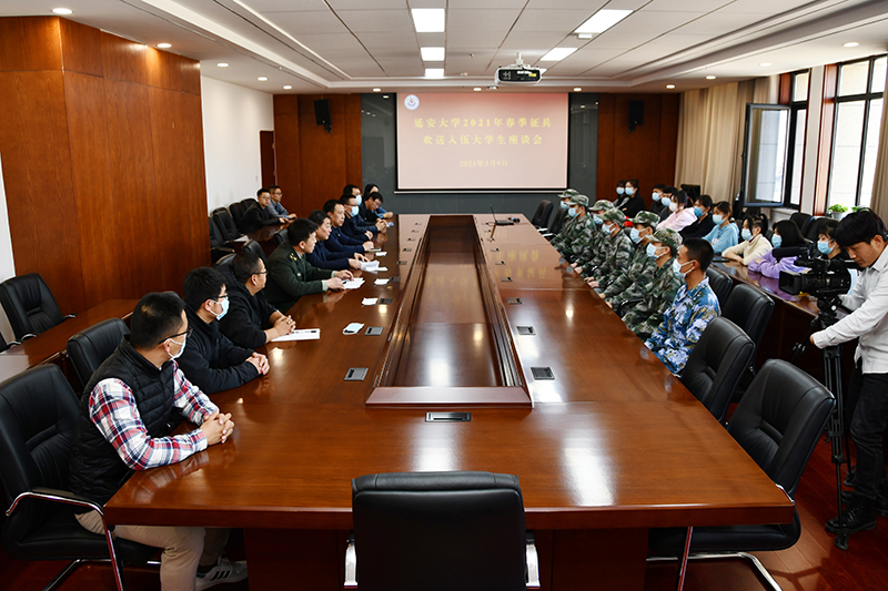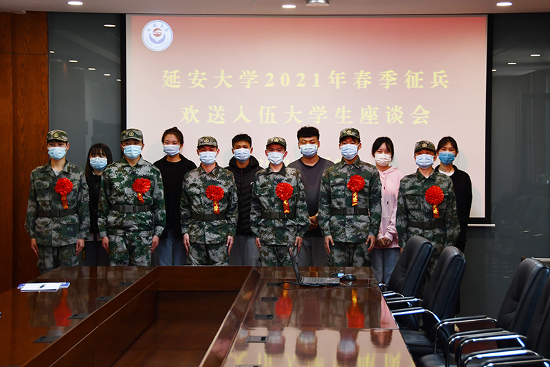 本网讯 3月9日下午,米兰在新城校区行政楼七楼会议室举行2021年春季应征入伍大学生欢送会。校党委副书记陈华,学工部、武装部等部门负责人,学院副书记、辅导员,6名预定新兵(男)和10名应征体检合格女大学生及部分学生代表参加了会议。会议由校武装部副部长王彦杰主持。