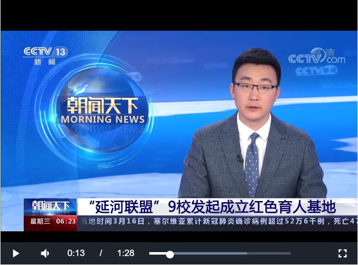 3月17日,中央电视台第十三套节目在《朝闻天下》栏目以“延河联盟”9校发起成立红色育人基地”为题,报道了“延河联盟”高校红色育人基地揭牌仪式暨党史学习教育。