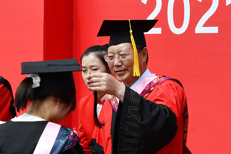 随后,与会的2021届毕业生一一登上主席台,张金锁、高子伟、武忠远、杨伟宏、付峰5位校领导和校学位评定委员会委员先后为毕业生拨流苏并颁发学位证书。