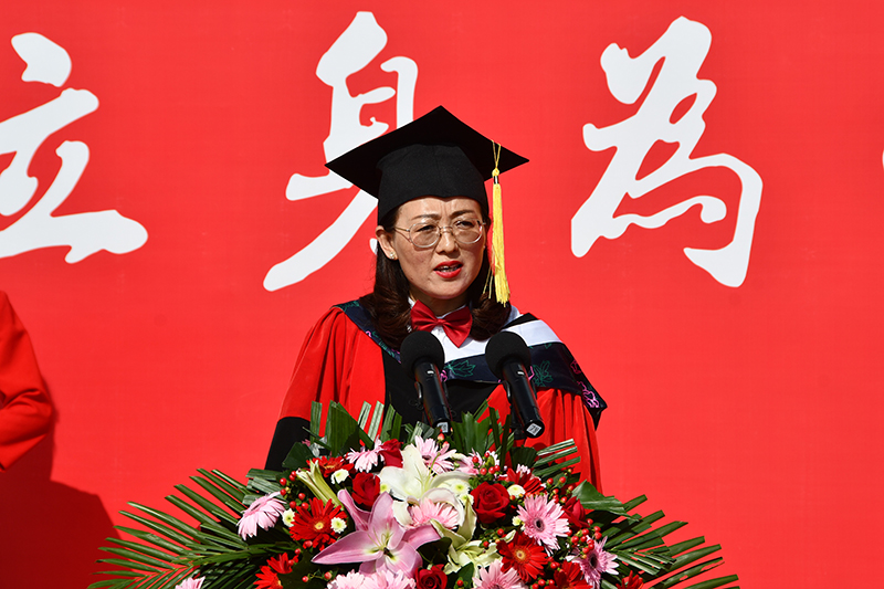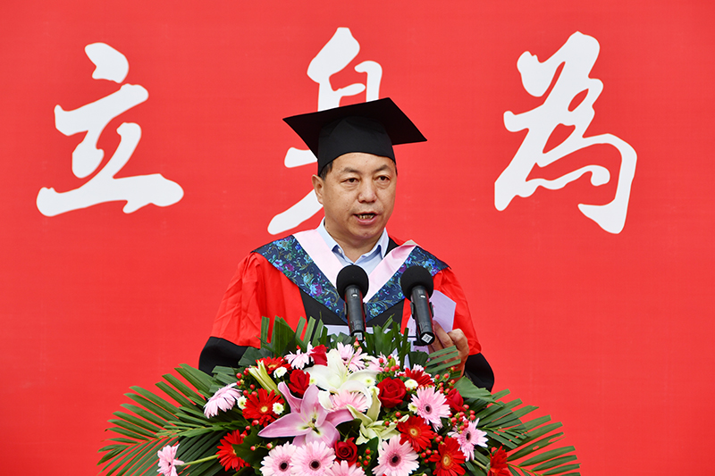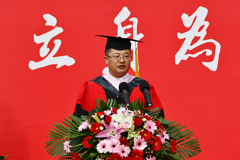 校长、校学位评定委员会主席高子伟作了题为《致敬光辉百年做弘扬延安精神的“延大人”》的讲话。他首先代表学校对顺利完成学业、即将走向人生新征程的3503名本科生和715名研究生表示热烈祝贺。高子伟指出,同学们在延大这所红色熔炉、温暖摇篮,秉承“立身为公、学以致用”的校训,在延安精神的滋养下,既“学知识”,更“学做人”,成长为具有延安精神特质、流淌红色基因的“yyds”青年。他对同学们在学校抗疫大局中做出的贡献表示感谢,对同学们追求新知、勇于实践,在学业上取得的成果表示祝贺,并勉励同学们自觉践行延安精神,矢志用青春拼搏奋斗,在实践历练中成长成才、在广阔天地间建功立业、在奉献祖国中展翅翱翔。