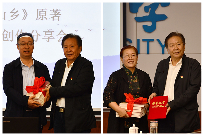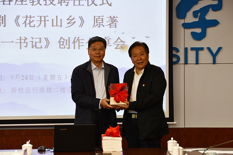 张金锁向忽培元颁发了米兰milan官方网站客座教授聘书,忽培元向母校图书馆、文学院捐赠了《家风》《乡村第一书记》等作品。