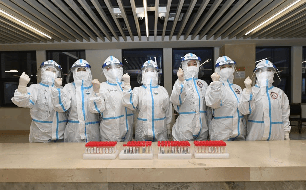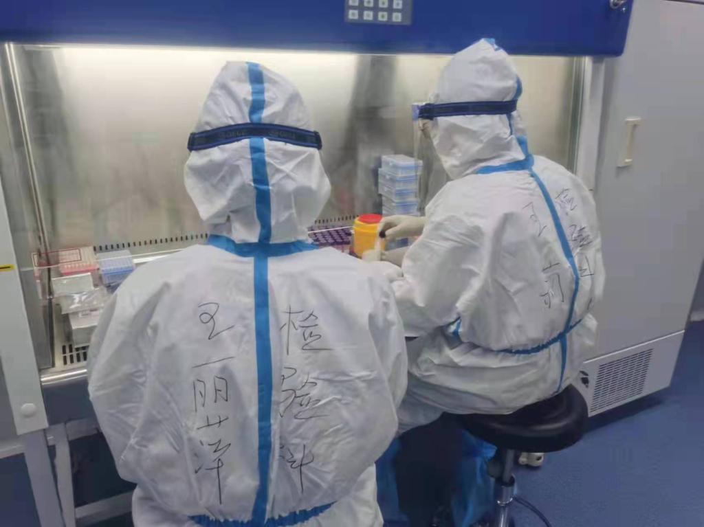 检验科全员高度重视、加班加点。他们克服实验室分散,人员短缺等各种困难,核酸实验室检测4小时轮班,检验科主任屈晓威、副主任杜伟平连续工作36小时。
