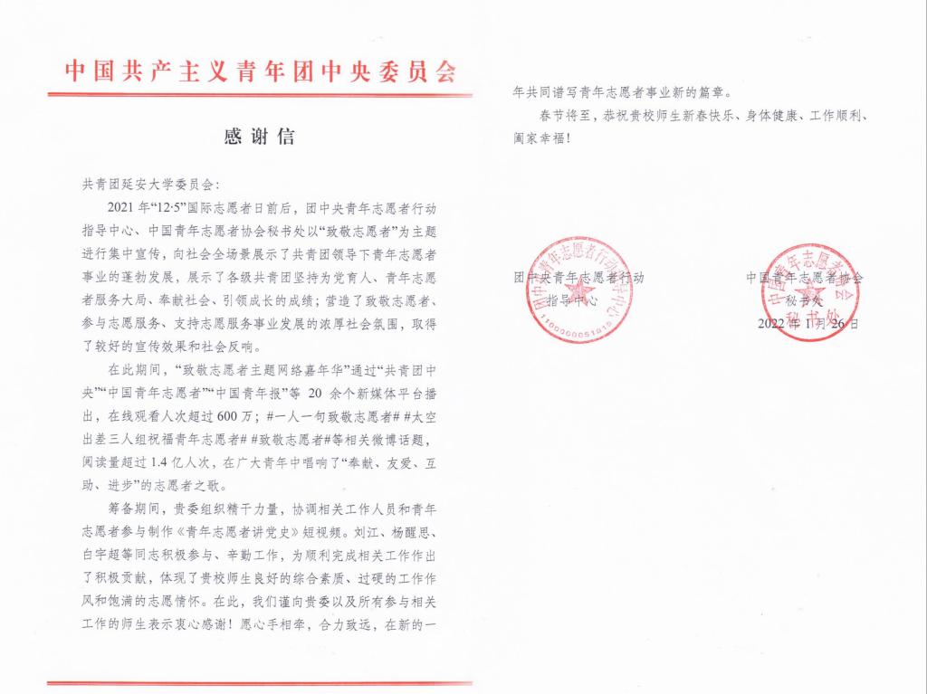 团中央青年志愿者行动指导中心和中国青年志愿者协会秘书处在信中指出,2021年“12·5”国际志愿者日前后,以“致敬志愿者”为主题进行的集中宣传,向社会全场景展示了共青团领导下青年志愿者事业的蓬勃发展,在广大青年中唱响了“奉献、友爱、互助、进步”的志愿者之歌。筹备期间,米兰milan官方网站团委组织精干力量,协调相关工作人员和青年志愿者参与制作《青年志愿者讲党史》短视频,为顺利完成相关工作作出了积极贡献,体现了米兰milan官方网站师生良好的综合素质、过硬的工作作风和饱满的志愿情怀。