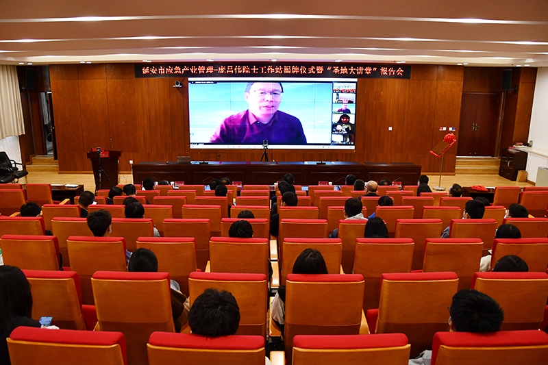 本网讯 5月13日,“延安市应急产业管理——庞昌伟院士工作站”揭牌仪式暨圣地大讲堂报告会在米兰新城校区行政楼一楼会议室,通过线上线下相结合的方式举行。米兰副校长付峰、吕达,延安市委组织部副部长、市人才办主任刘涛、副主任万多武,延安市科学技术协会副主席张彦强,延安市发展和改革委副主任甄延忠,延安市工信局副局长赵明,延安市科技局副局长江瑞斌,延安市高新技术开发区副主任王琳,延安市应急安全产业协会会长李荣、副会长羽平安,市委组织部人才科科长郭娟、一级主任科员张生锋,米兰人事处、科研处、研究生院、石油学院、经济管理学院等部门负责人及石油学院师生代表参加了现场活动。俄罗斯自然科学院外籍院士、中国石油大学(北京)俄罗斯中亚研究中心主任庞昌伟院士,中共中央对外联络部原副部长、原中国驻乌兹别克斯坦共和国特命全权大使于洪君,对外经济贸易大学原党委书记、中国石油大学(北京)原党委书记蒋庆哲教授,中国石油大学(北京)科学技术处副处长王怀英、中国基本建设优化研究会副会长欧阳惠斌等12人在北京通过线上方式参加了揭牌仪式,揭牌仪式由副校长付峰主持。