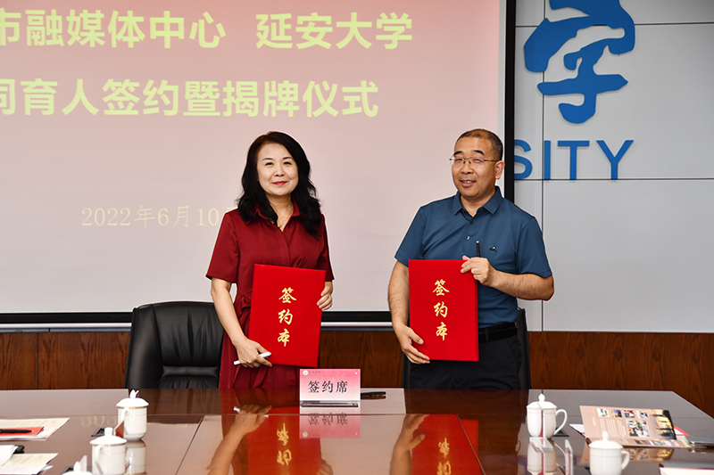 签约暨揭牌仪式上,米兰milan官方网站党委宣传部常务副部长刘小淼与延安市融媒体中心编辑中心主任、延安融媒发展(集团)有限公司常务副总经理李进平,共同签署了协同育人合作框架协议书。根据合作协议,双方将按照“优势互补、务求实效、互利共赢、共同发展”的原则,在新型媒体人才培养、外宣平台搭建、共建“融媒体工作室”与“米兰milan官方网站思想政治教育网”、联合推广学校思想政治育人产品、全面建设线上校史陈列馆与路遥文学馆等方面开展全方位、战略性、实质性的合作。