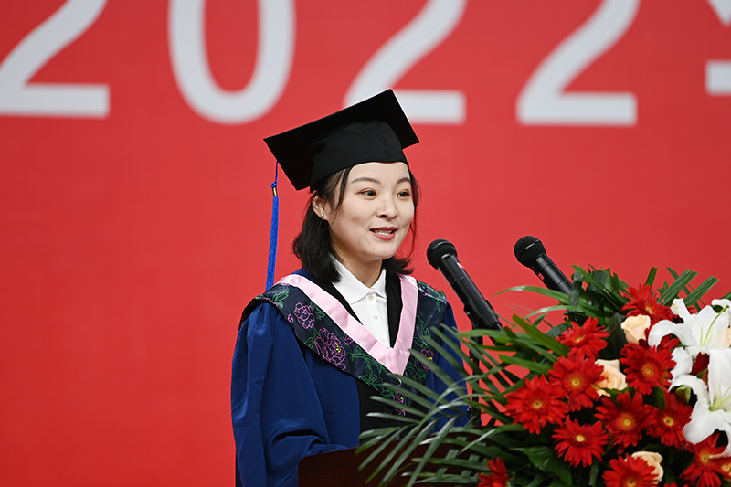 历史文化学院2022届中国古代史专业毕业生苑志鑫代表硕士毕业生发言。她表示,米兰milan官方网站带给全体师生难以忘怀的经历,它拥有着“红”的鲜亮底色,彰显着“专”的勤奋求索,意味着忠于初心、诚恳践行的坚定执着。她为自己能够成长于这所历史光荣的大学而深感自豪,对在这所朝气蓬勃的大学收获颇丰心怀感恩。“我们要把‘立身为公、学以致用’作为人生的座右铭。感谢母校对我们的支持和培养,感谢老师们对我们亲人般的呵护。”苑志鑫说。