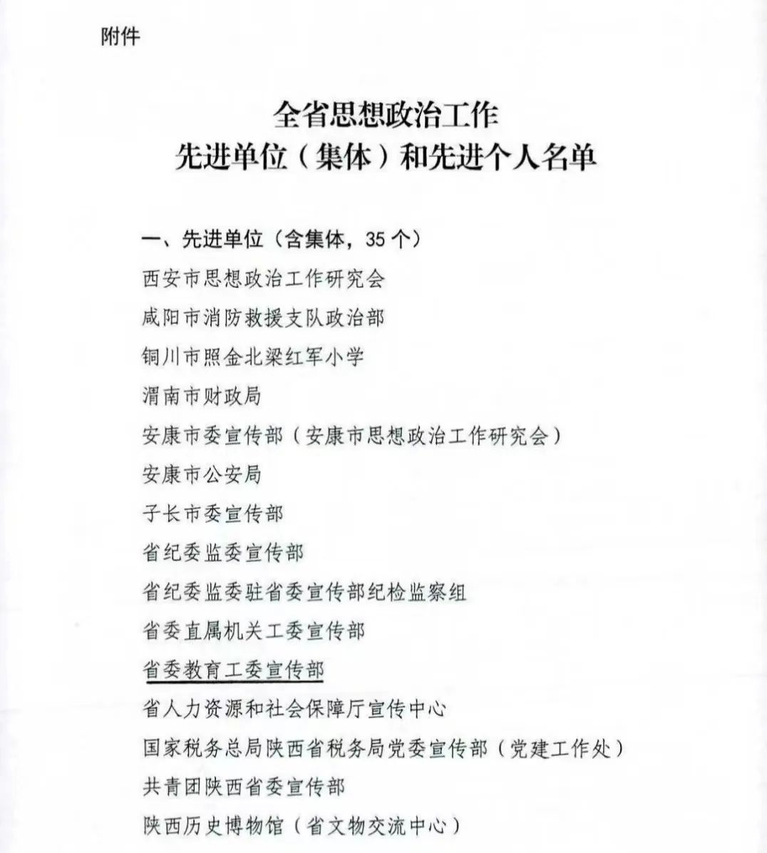 近日,中共陕西省委宣传部、陕西省思想政治工作研究会通报表彰了全省思想政治工作先进集体,全省仅有5所本科院校入选,米兰位列其中。