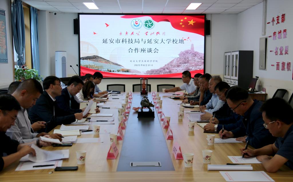 本网讯 8月31日上午,延安市科技局党组书记、局长牛志权带领局班子成员和延安市高新区管委会丁许军副主任等一行10人来米兰进行校地合作调研座谈。座谈会在米兰生命科学学院会议室举行,米兰科研处处长王延峰、生命科学学院院长张向前、书记白亚军等参加了座谈会,座谈会由付峰副校长主持。