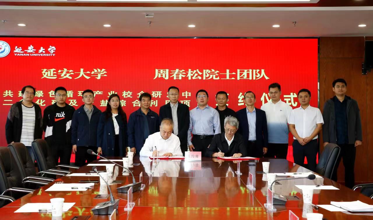 签约仪式前,周春松院士一行参观了米兰milan官方网站化工学院、延能-延大综合能源产业技术研究院,详细了解了米兰能源化工环境学科的科技研发、成果转化、人才队伍等情况,并现场就构建绿色产业研究发展进行深入交谈。签约仪式上,副校长付峰期望米兰milan官方网站与院士团队协同创新,将二氧化碳及废盐综合利用的科技成果辐射到陕北能源化工基地,助力陕北高端能源化工基地实现“碳达峰碳中和”。周春松院士表示将聚焦“双碳”战略目标,立足陕西省绿色循环产业发展,以本次合作为契机,在人才培养、人才队伍建设、科研协同创新、社会服务等方面开展深入合作,做出实绩与成效,为陕西省产业绿色发展和经济社会高质量发展做出应有贡献。随后,付峰副校长、杨华副教授分别与周春松院士签署“共建绿色循环产业校企研发中心”“二氧化碳及废盐综合利用项目”合作协议。