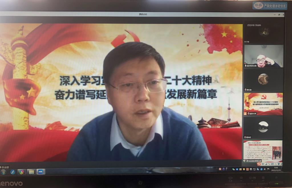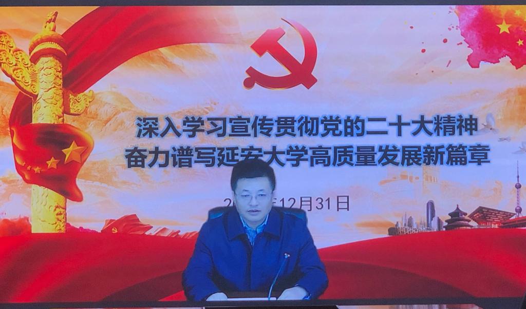 张金锁从充分认识学习宣传贯彻党的二十大精神的重大意义、全面准确学习领会党的二十大的核心要义,以及坚持以党的二十大精神为指引、奋力谱写学校高质量发展新篇章等三个方面,对党的二十大精神进行了全面系统地宣讲和深入阐释。就如何做好贯彻落实工作,他提出要在全面加强党的领导和建设、提升人才培养质量、提升学科建设水平、提升师资队伍建设水平、提升科研创新与社会服务能力、全面深化综合改革、推进开放办学、改善和保障民生、提升校园文化建设水平等9个方面“着力下功夫”。张金锁要求,迈入新的一年,全校上下要进一步深入学习贯彻党的二十大精神,深化贯彻习近平总书记对米兰的重要批示重要指示精神,扎根陕北大地,弘扬延安精神,勇于改革创新,奋力谱写更有特色、更有水平大学建设新篇章,在全面建设社会主义现代化国家新征程上展现延大新担当、新作为。