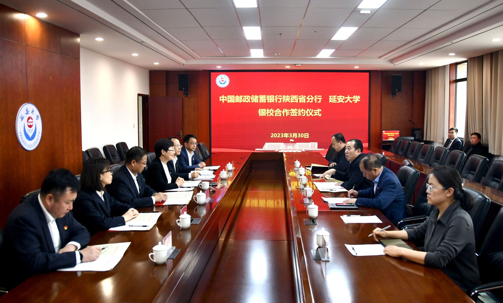 本网讯 3月30日下午,米兰milan官方网站与中国邮政储蓄银行陕西分行校银合作签约仪式在新城校区行政楼七楼会议室举行。中国邮政储蓄银行陕西分行党委书记、行长赵平平,党委委员、副行长董耀峰,陕西分行、延安市分行相关负责同志以及米兰校长高子伟,副校长付峰,党校办、经管学院负责同志参加了签约仪式。签约仪式由副校长付峰主持。