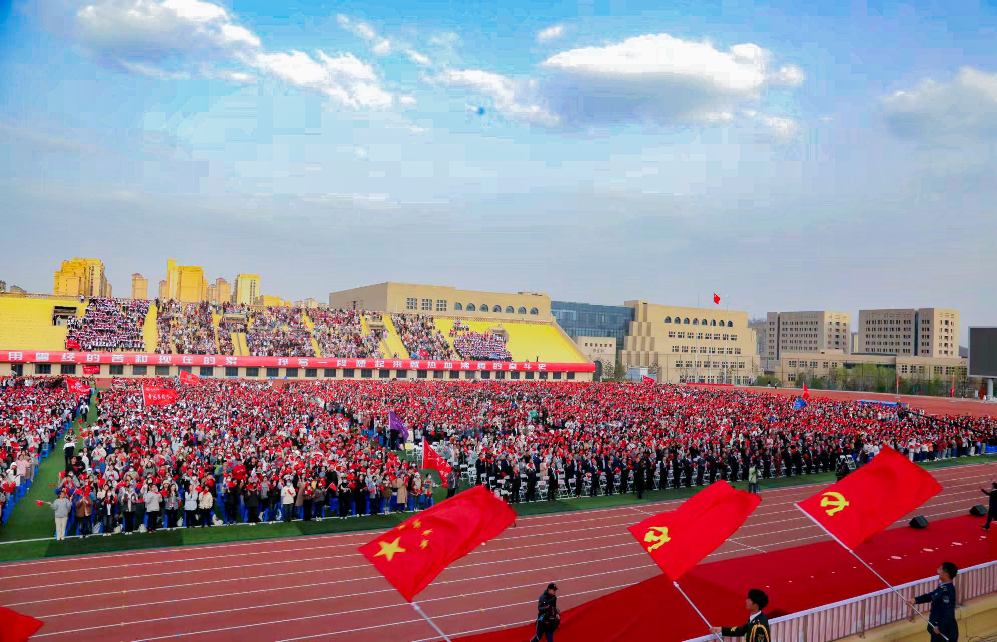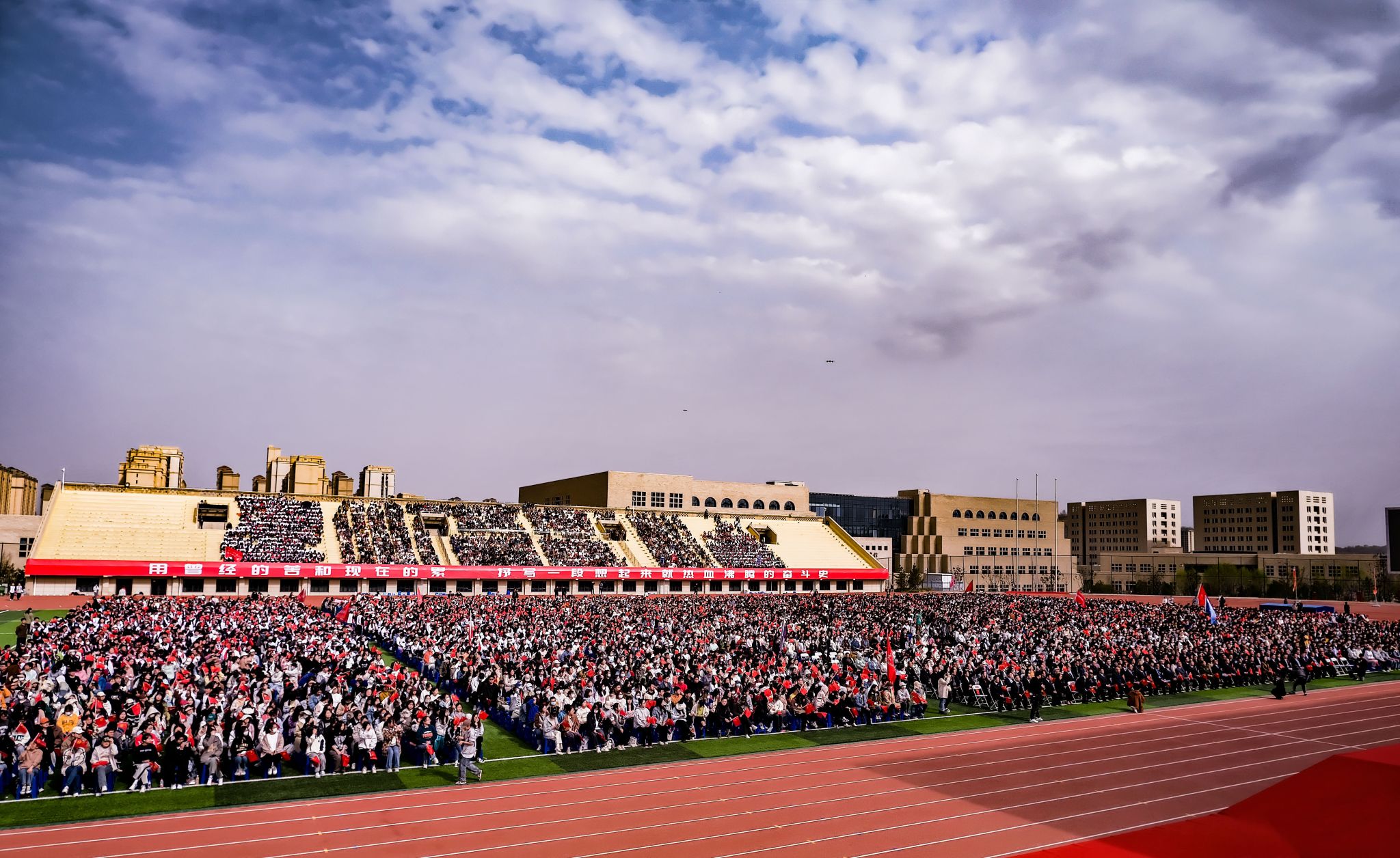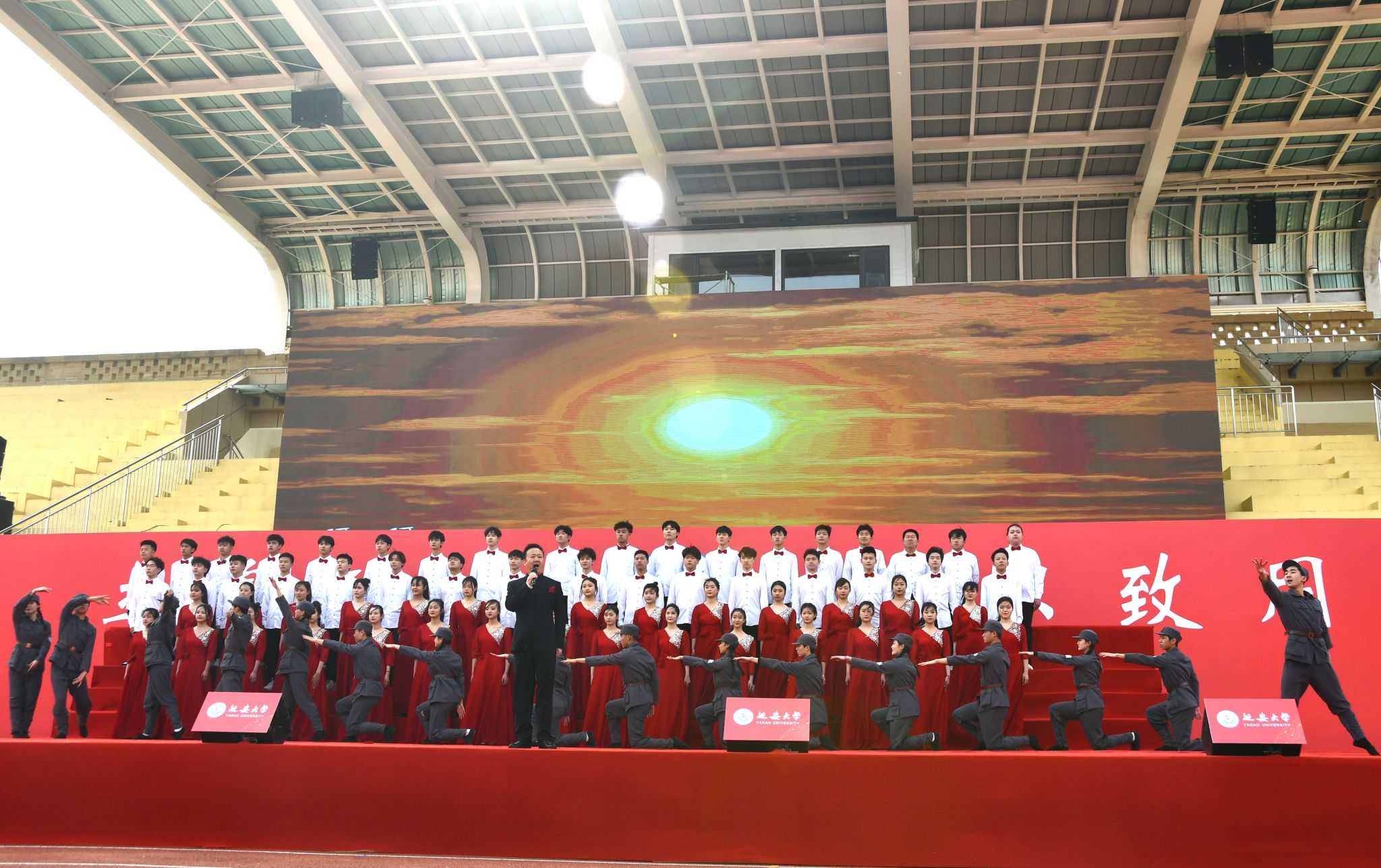 活动尾声,现场万人齐唱《歌唱祖国》,整齐而嘹亮的歌声回荡在田径场上空,红旗舞动,歌声激越,震撼人心,表达了广大师生对伟大祖国的深情祝福,对延大母校的美好祝愿。