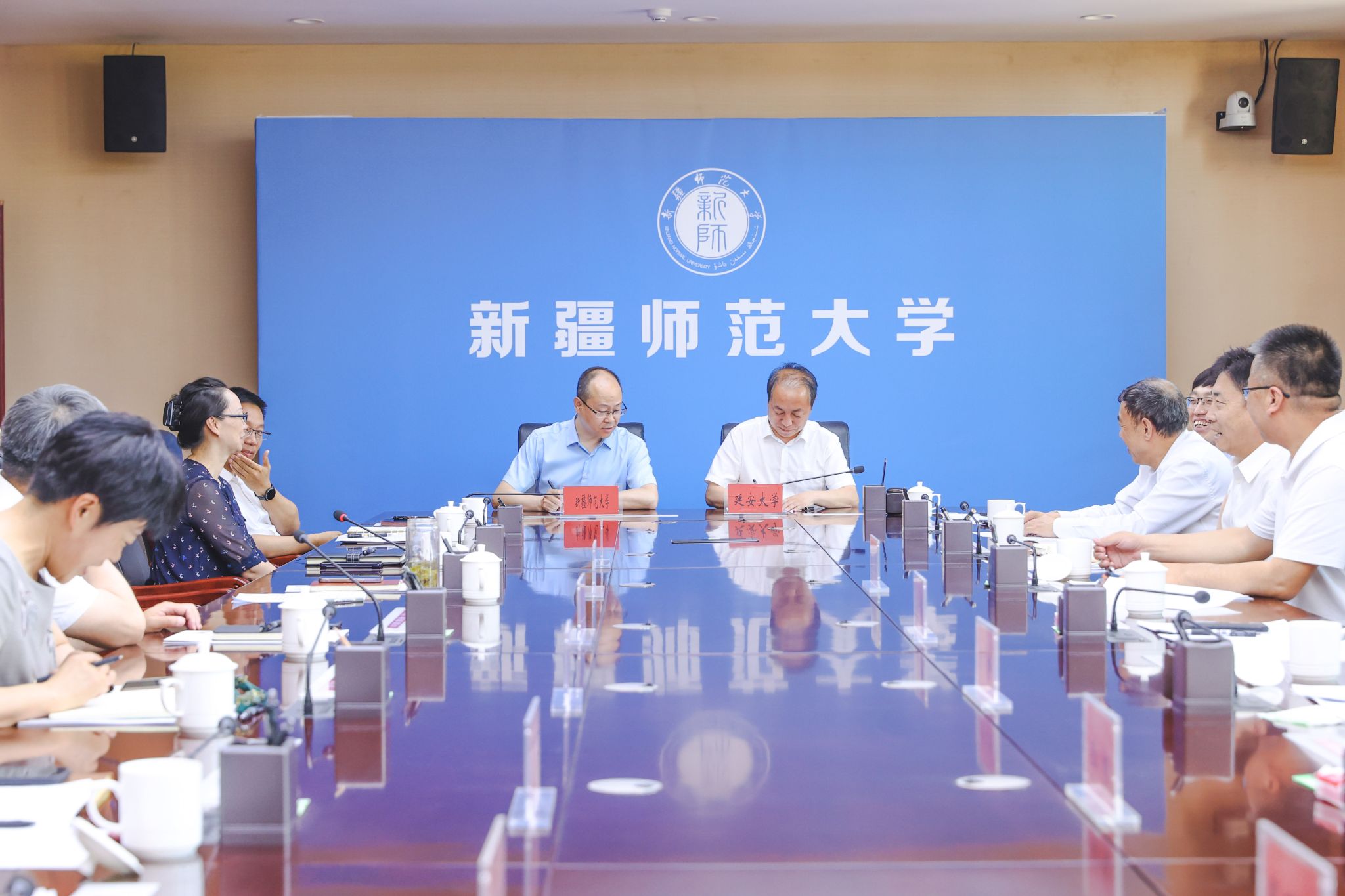 本网讯 6月25日,米兰与新疆师范大学战略合作框架协议签约仪式在新疆师范大学温泉校区举行。新疆师范大学党委书记葛国,校长吾满江·艾力,副校长季荣,党委常委关明,米兰校长高子伟,副校长付峰、谭虎娃,两校党办校办、人事处、研究生院、科研处、对外交流与合作处、马克思主义学院、化工学院等相关部门负责人参加了签字仪式。签字仪式由吾满江·艾力校长主持。