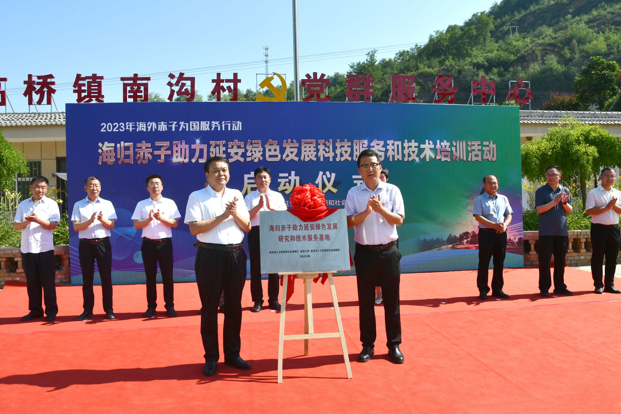 启动仪式上,刘涛和张向前共同为南沟村海归赤子助力延安绿色发展研究和技术服务基地揭牌。项目组成员在启动仪式现场为当地果农开展了农业生产技术培训和现场技术咨询活动,并为农户发放了团队编写的苹果病虫害防控技术手册和修枝剪、修枝锯、防护衣等生产资料。