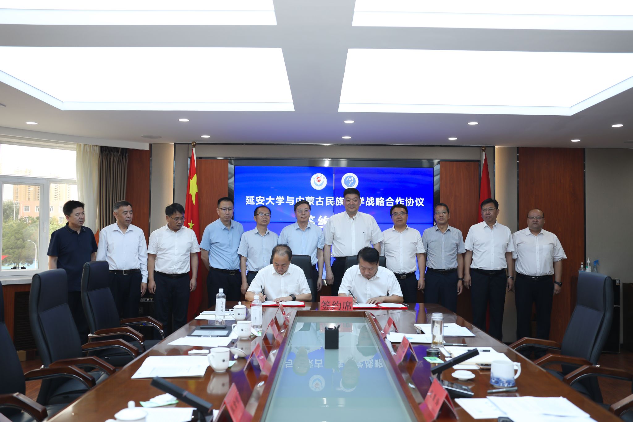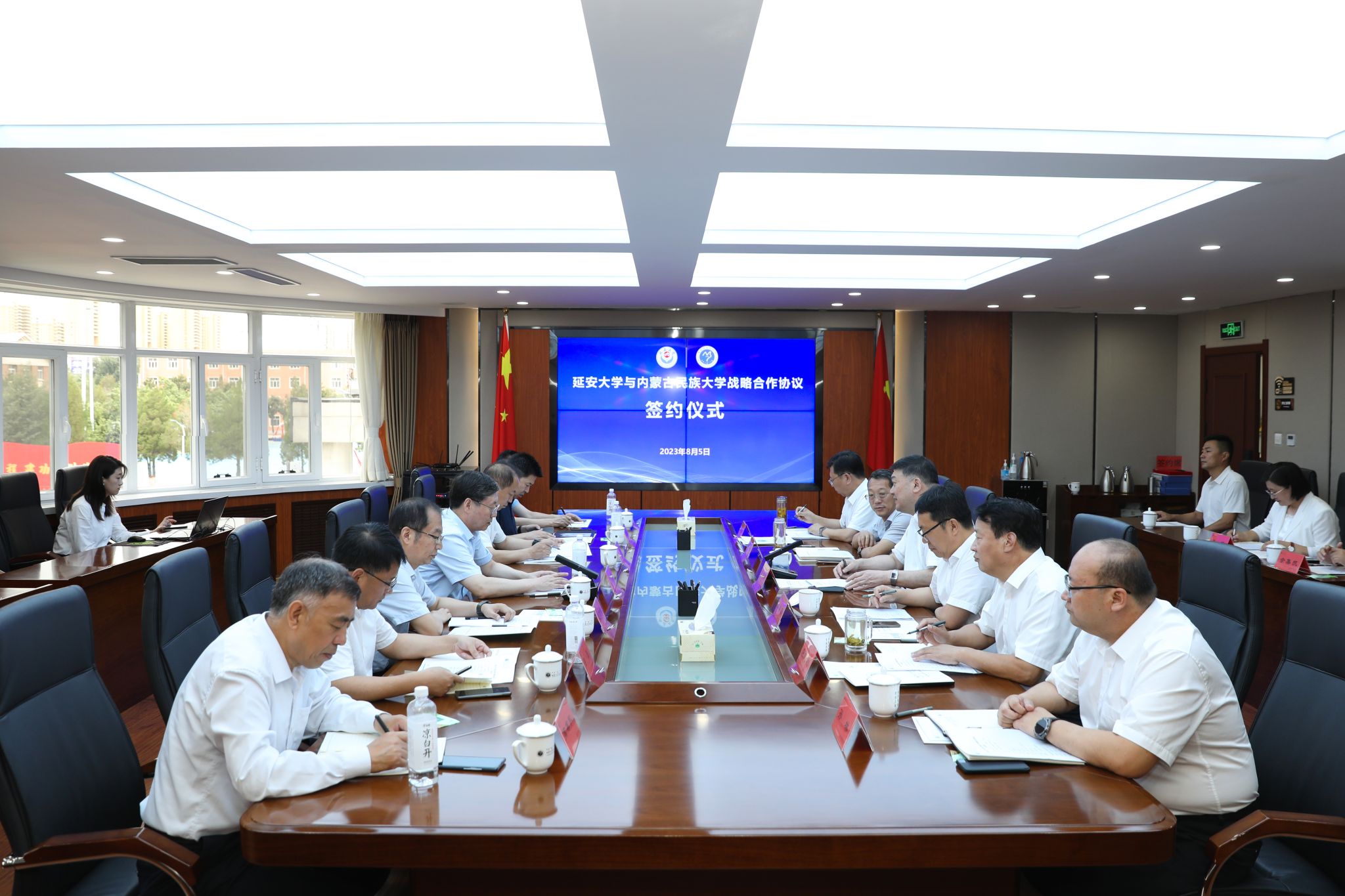 赵东海代表内蒙古民族大学对张金锁一行来校调研并签署战略合作协议表示热烈欢迎,并介绍了内蒙古民族大学的办学情况和办学成就,真诚期望两所学校广大师生继续发扬延安精神、蒙古马精神和三北精神,相互取长补短、互通有无,通过在干部培训、教学科研、学生管理等方面的真诚合作,为两所高校、两座城市各项事业的高质量发展,作出各自应有的贡献。